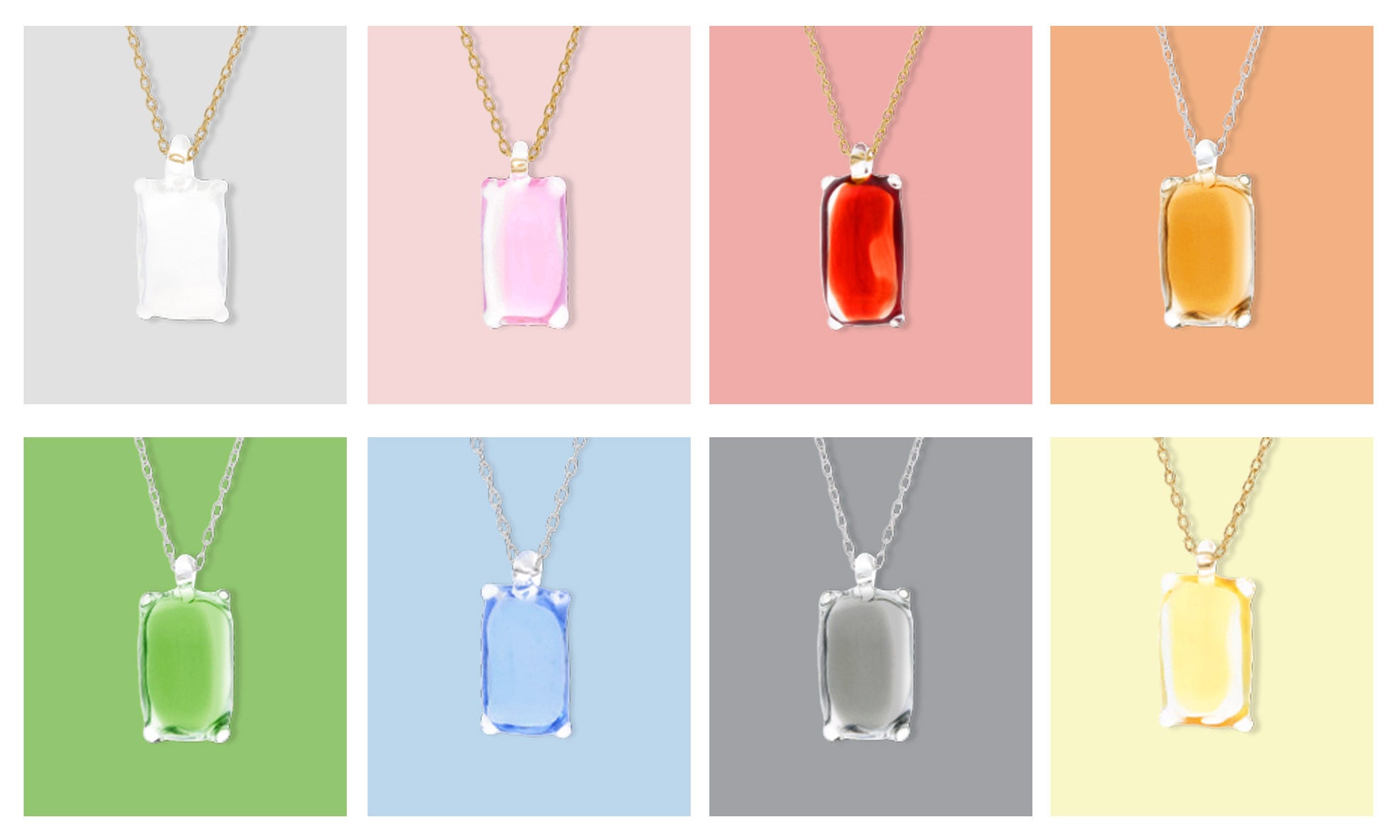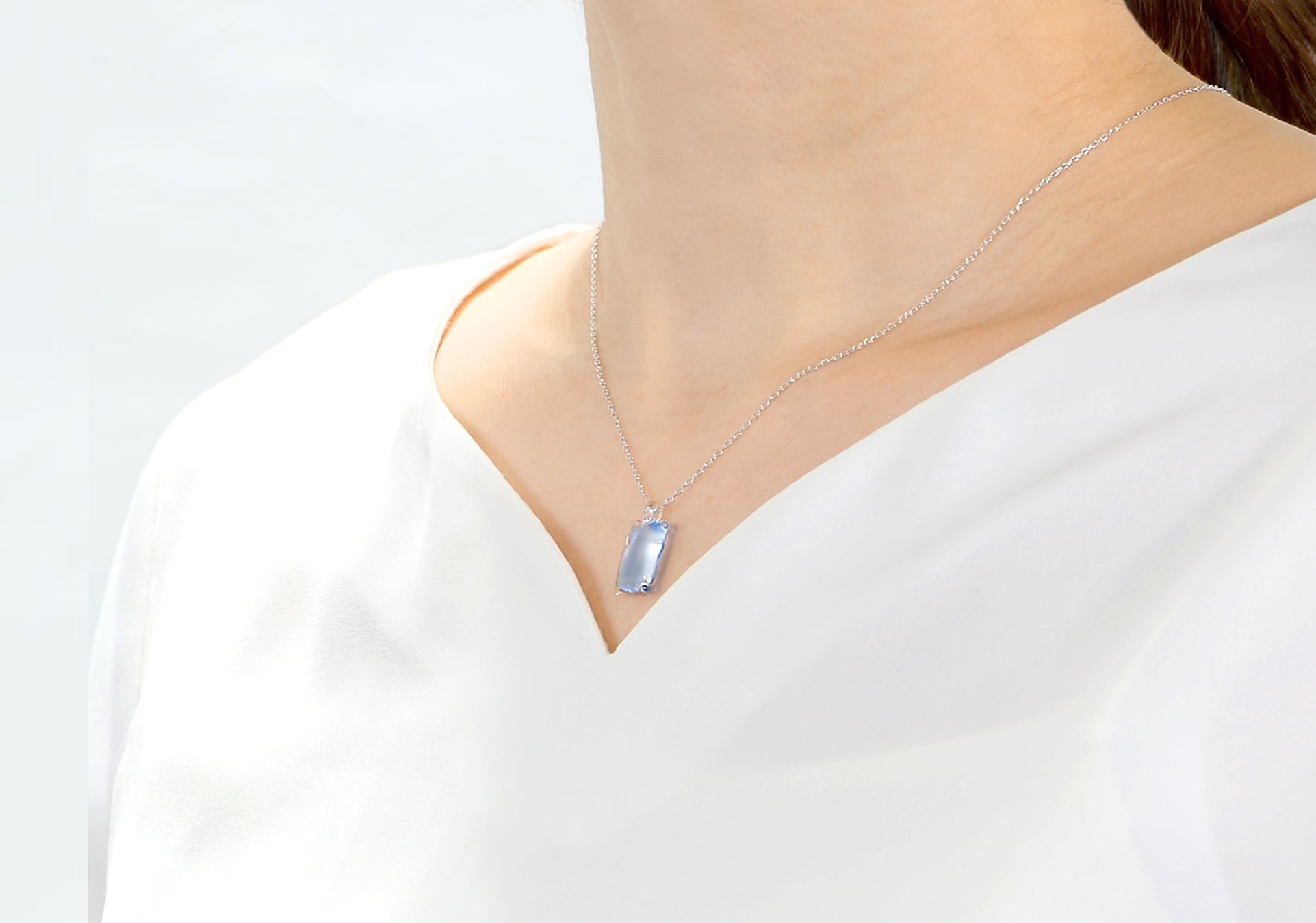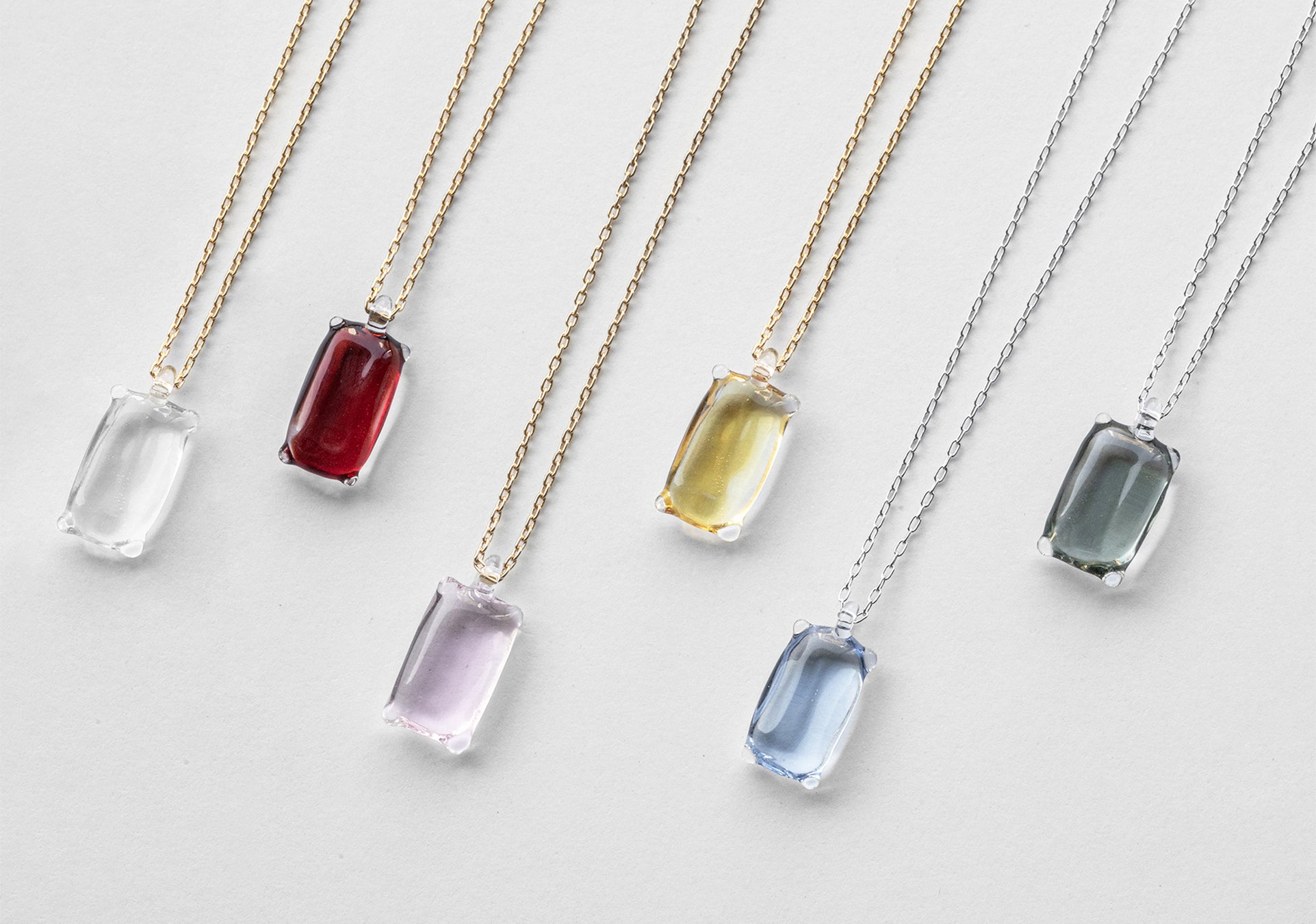 ネックレスの素材はガラスの中でも軽いけど割れにくい耐熱ガラス。ひとつひとつ、職人さんの手作りで作っています。手作りならではの直線的になりすぎないぷっくりとしたフォルムが魅力。シンプルな形でありながらも、光に反射して様々な表情が生まれます。
