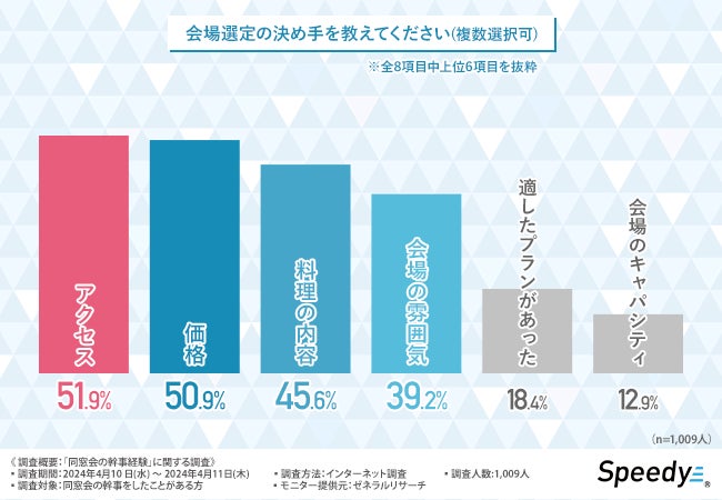 次に、「会場選定の決め手を教えてください(複数選択可)」と質問したところ、『アクセス(51.9%)』と回答した方が最も多く、次いで『価格(50.9%)』『料理の内容(45.6%)』と続きました。