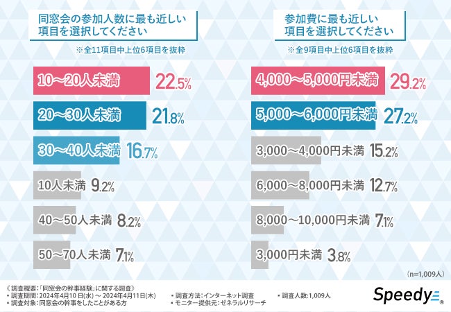 今回の調査結果において、同窓会の参加人数で最も多いのは10人〜20人未満で、参加費用は4,000円〜5,000円未満が最も多いことがわかりました。約4割が同窓会の参加人数は20人程度を望み、約6割が最高でも40人程度と考える傾向にあるようです。約6割が参加費は5,000円程度を望む傾向が示されました。