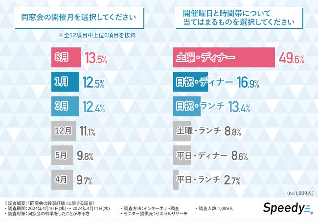 開催月は8月や1月が多く、開催曜日と時間帯は土曜日のディナーが最も多かったことから、お盆休みや年末年始、週末といった、より多くの参加者が集まりやすい時期に同窓会が開催されていることが明らかになりました。