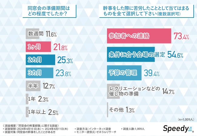 「同窓会の準備期間はどの程度でしたか?」と質問したところ、『2ヶ月(25.3%)』と回答した方が最も多く、次いで『3ヶ月(23.8%)』『1ヶ月(21.8%)』と続きました。