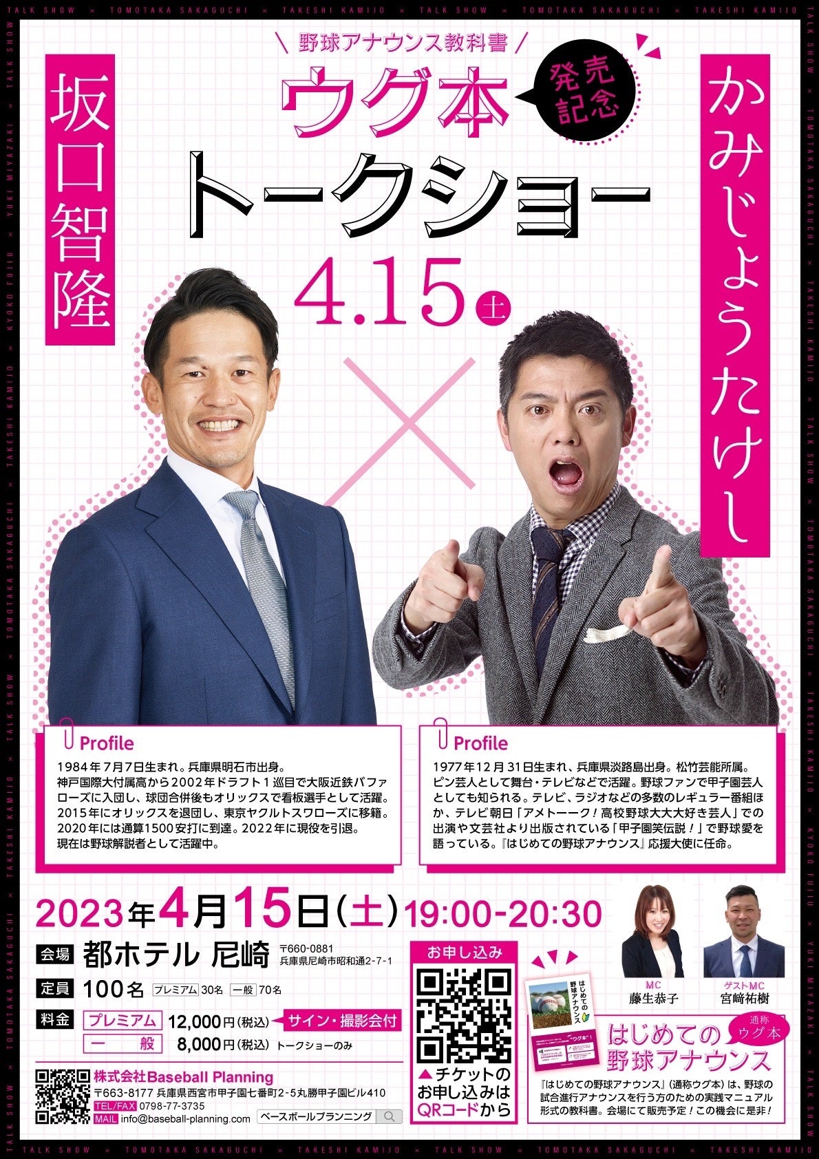 『はじめての野球アナウンス』発売記念として、豪華ゲストを招き、野球の魅力を語りつくすスペシャルトークショー。元オリックス・ヤクルトで活躍した坂口智隆氏をゲストに迎え、はじめての野球アナウンス(通称:ウグ本)応援大使に就任した高校野球芸人、かみじょうたけし氏と野球をテーマに熱く語り合います。元オリックス宮﨑祐樹氏もゲストMCとして参戦、これはもう、熱い時間にならないわけがない?!