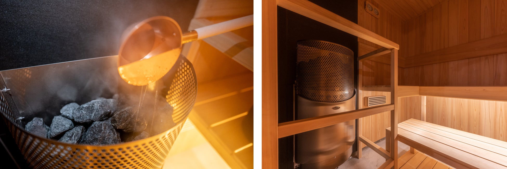 もう1種類のサウナは、本場フィンランド製のMISAストーブを使用したロウリュサウナです。サウナストーンもフィンランドから輸入し本場の設備に拘りました。そしてロウリュに重要なアロマは、天然製油の水溶性国産アロマを選びました。こちらはサウナ専門ハーブ店「アルテミスの薬草店」のサウナ専用アロマオイルです。国産を選んだ理由としては、日本人の好むアロマに調合されている事、そして人工香料不使用なでお肌にも安心、気化しても目が痛くなる事はありません。3種類の香りからお好みの1つをお選びいただきます。