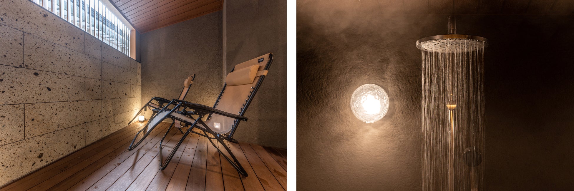 サウナの後に、しっかり「ととのう」方は外気浴テラスのインフィニティチェアでお過ごし頂き、また温度差が心配な方には浴室内の「寝転がりクッション」スペースをご利用いただけるよう、両方の過ごし方をご用意しています。