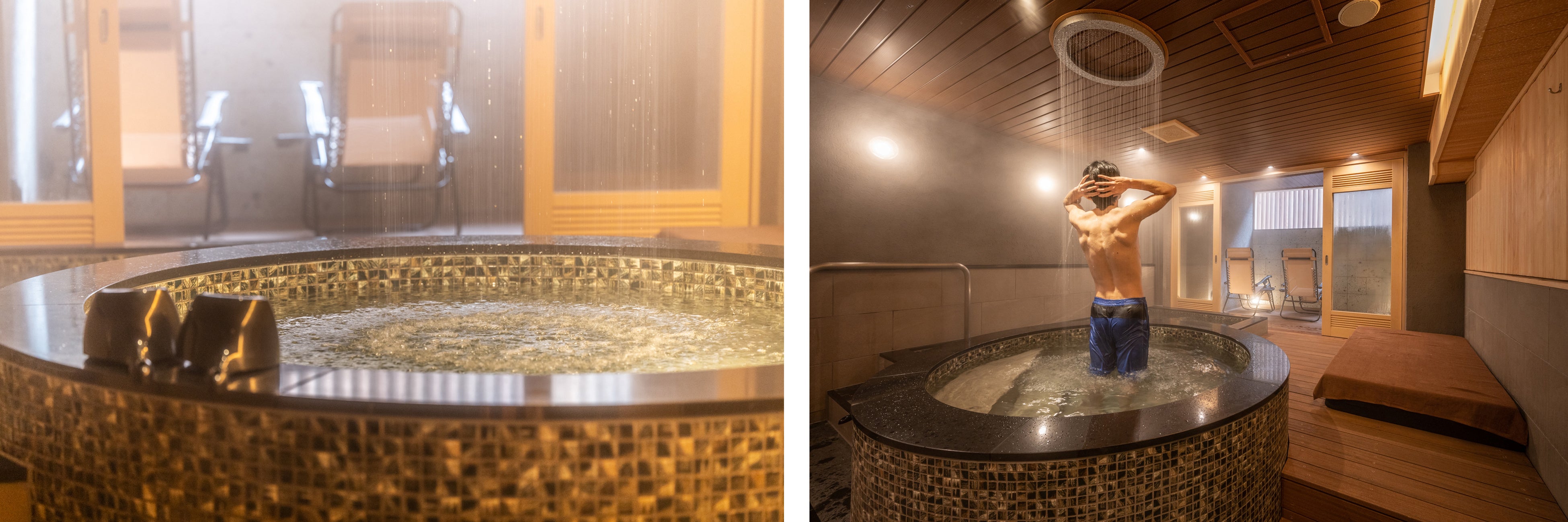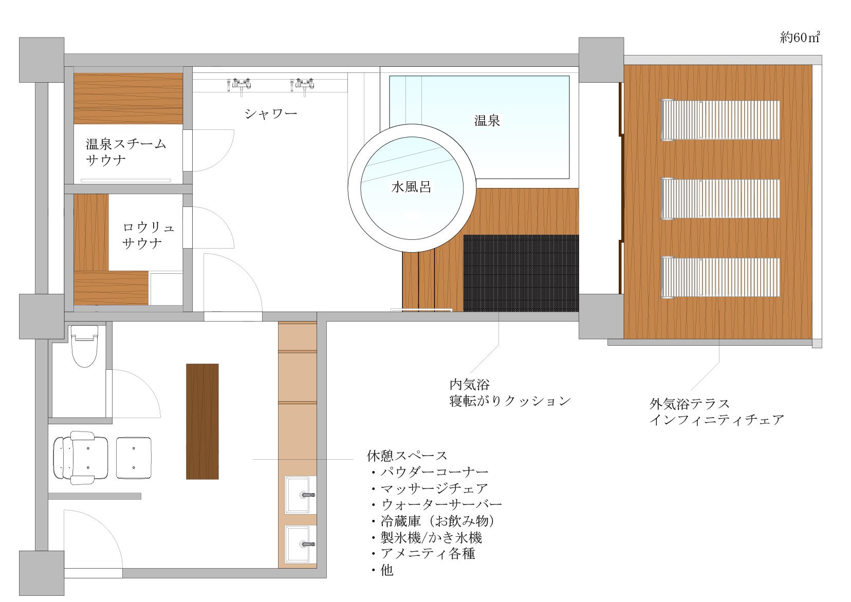 ■浴室内設備…温泉スチームサウナ/ロウリュサウナ/水風呂(水深60cmリング型シャワー付)/温泉(源泉掛け流し)/シャワーカラン2ヶ所/寝転がりクッション/外気浴テラスにインフィニティチェア3個