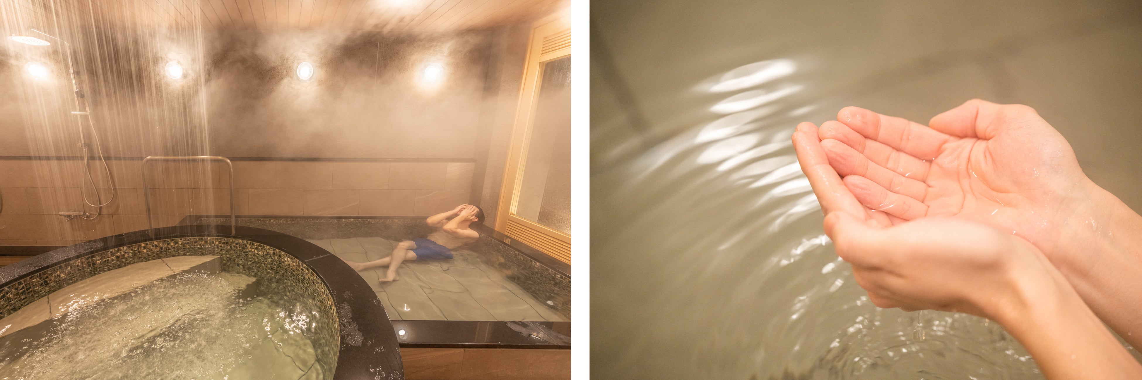 天然温泉100%の蒸気を浴びる「スチームサウナ」は、約55度の低温サウナです。熱気による息苦しさが少なく、体に優しいサウナです。スチームサウナならではの発汗、血行促進による美肌効果、自律神経が整うことによるリラックス&リフレッシュ効果に加え、温泉の効能が体に染みわたる効果が期待できます。当館の泉質は「美肌の湯」といわれる低張性弱アルカリ性。毛穴の汚れを落とすと同時に「すべすべの湯」が全身に染みわたります。