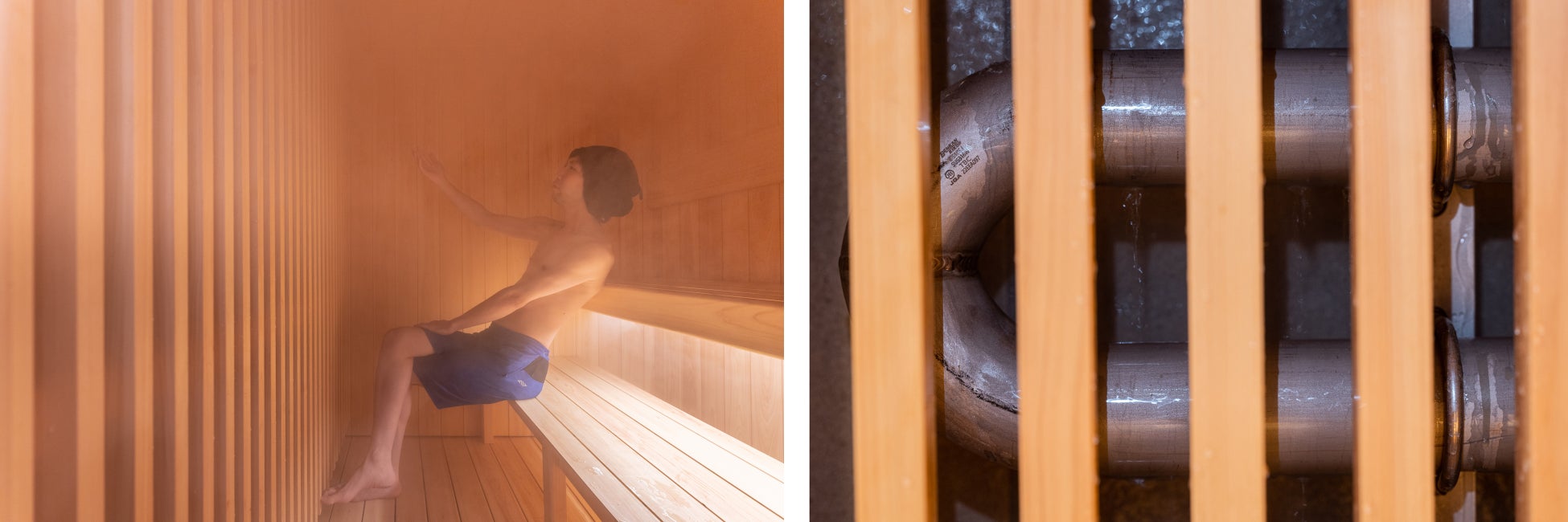 当館の温泉スチームサウナは、自家源泉(約70度)が流れる温泉管に温泉水を垂らして蒸気を発生させる構造です。これは、「源泉が高温である事」「湯量が豊富である事」「設備を痛めない泉質である事」など、一定の条件が揃わないと実現ができません。また、このような構造を採用する事で、「熱源を一切使用しない温泉スチームサウナ」として環境にも優しく、サスティナブルな設備となりました。このような環境だからこそ実現できた、全国的にも非常に珍しい「スチームサウナ」です(サウナ建設の専門家より)