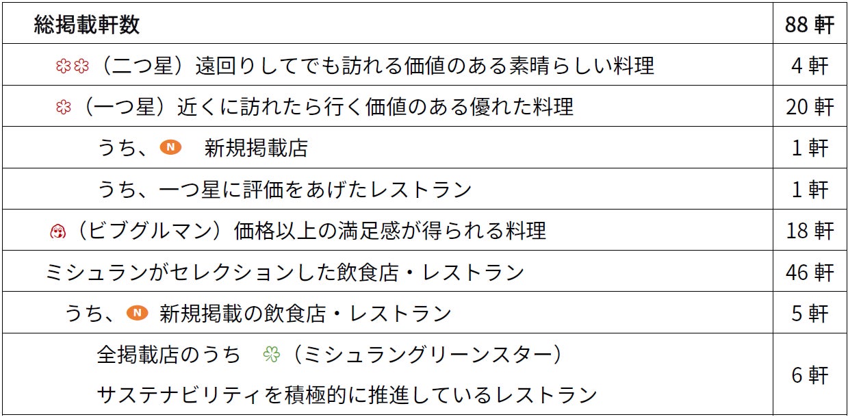 ・ 二つ星は、いずれも奈良市の「アコルドゥ」/イノベーティブ、「御料理 花墻(おりょうりはながき)」/日本料理、「白(つくも)」/日本料理、「奈良 而今(ならにこん)」/日本料理の4軒で、昨年の評価を維持しました。