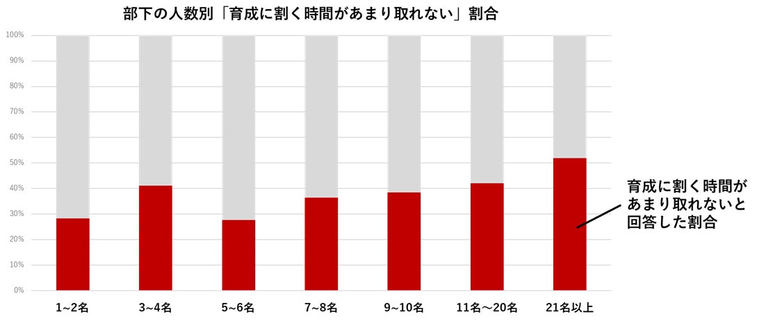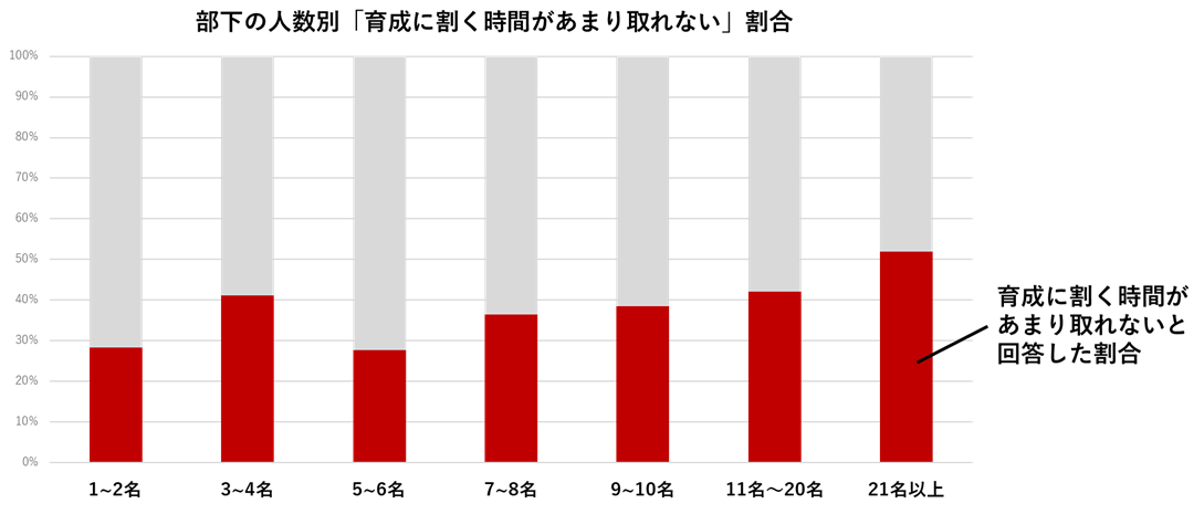 「育成に割く時間があまり取れない」と回答した管理者は部下の数が多くなるほど、回答割合が高まります。