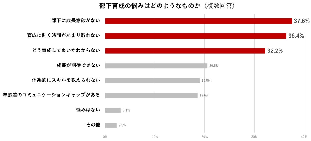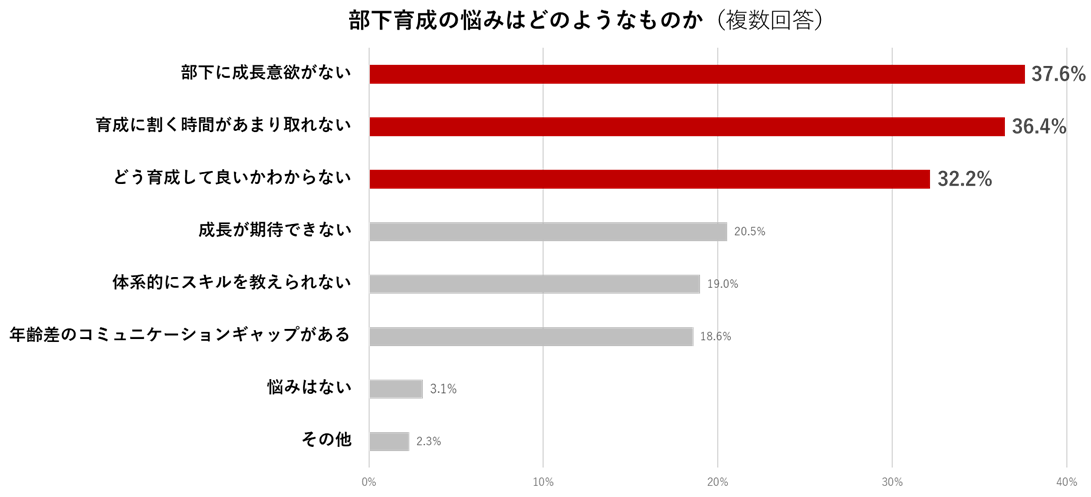 「部下の育成に関する悩み」を複数回答で聞いたところ、「部下に成長意欲がない」が37.6%、「育成に割く時間があまり取れない」が36.4%、「どう育成して良いかわからない」が32.2%という結果でした。部下本人のモチベーション、業務量の時間配分、育成方法のナレッジ不足の3つが課題であることが浮かび上がりました。