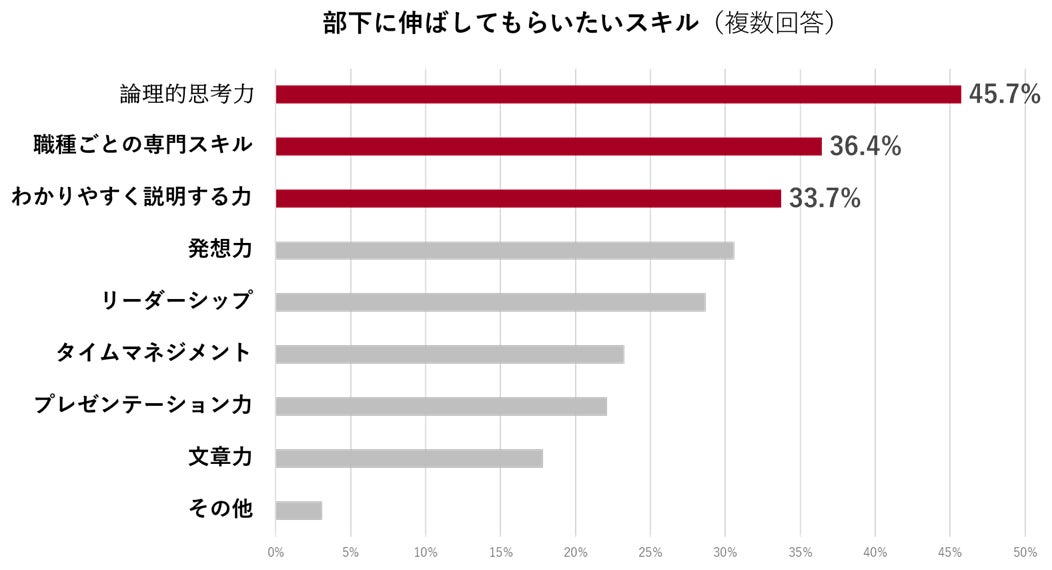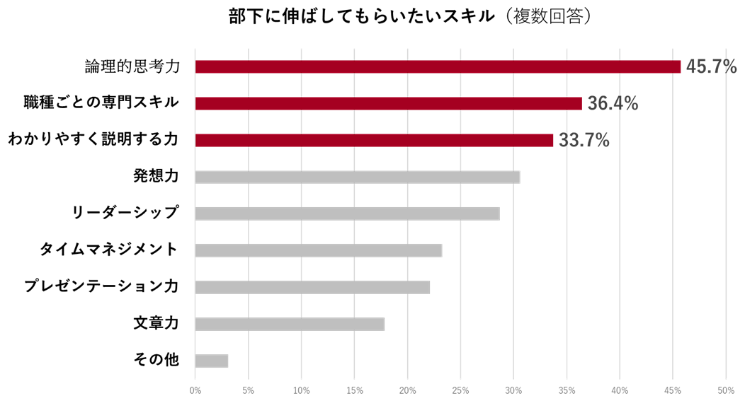 部下に伸ばしてほしいスキルを複数回答で尋ねたところ、第1位は「論理的思考力」で全体の45.7%と突出していました。次に「職種ごとの専門スキル」、「わかりやすく説明する力」と続き、上位3つのスキルは全体の3分の1を超える要望が集まっています。