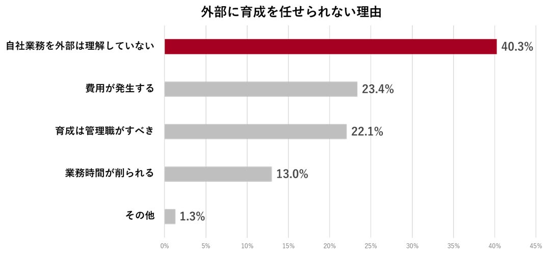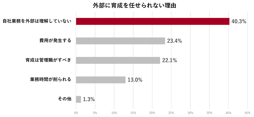 一方、外部に育成を任せても助からないと回答をした管理職に理由を尋ねたところ、「自社業務を外部は理解していない」が40.3%と断トツの第1位でした。