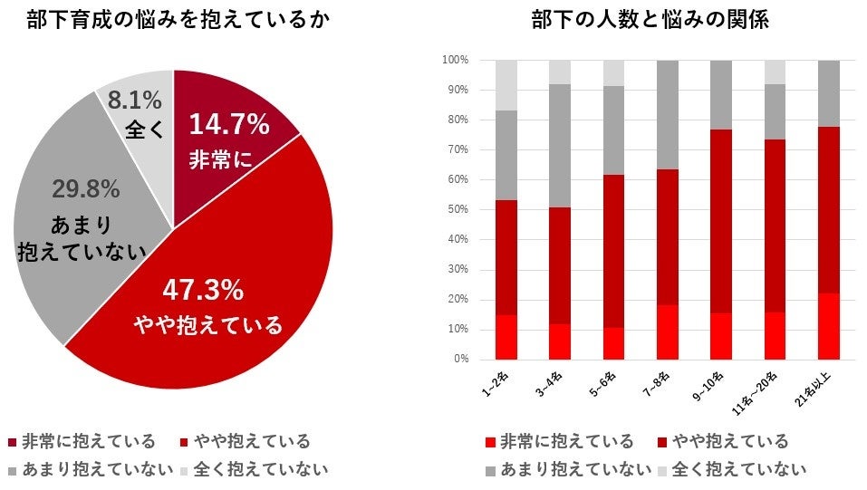「部下の育成に悩みを抱えているか」という質問に対して、「非常に抱えている」が14.7%、「やや抱えている」が47.3%と62.0%の管理職が部下の育成に悩みを抱えていることが明らかになりました。