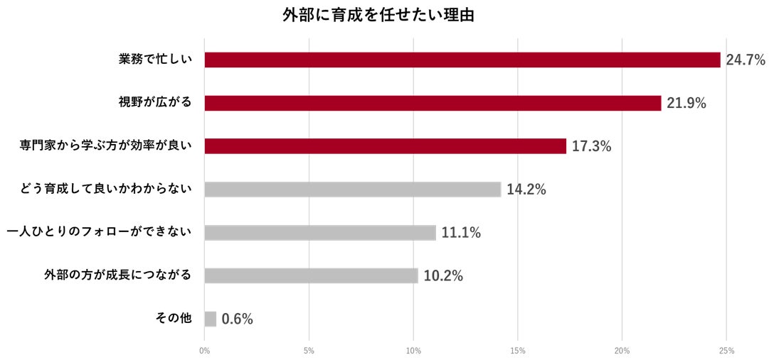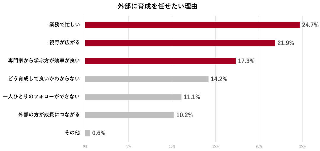 外部に育成をある程度任せられたら助かるか、という質問に対して78.3%の管理職が「非常に助かる」「かなり助かる」と回答しました。その理由をあわせて尋ねたところ、「管理職自身が業務で忙しく時間が取れない」が24.7%で最も多く、「視野が広がる」「専門家から学ぶ方が効率が良い」が続きました。