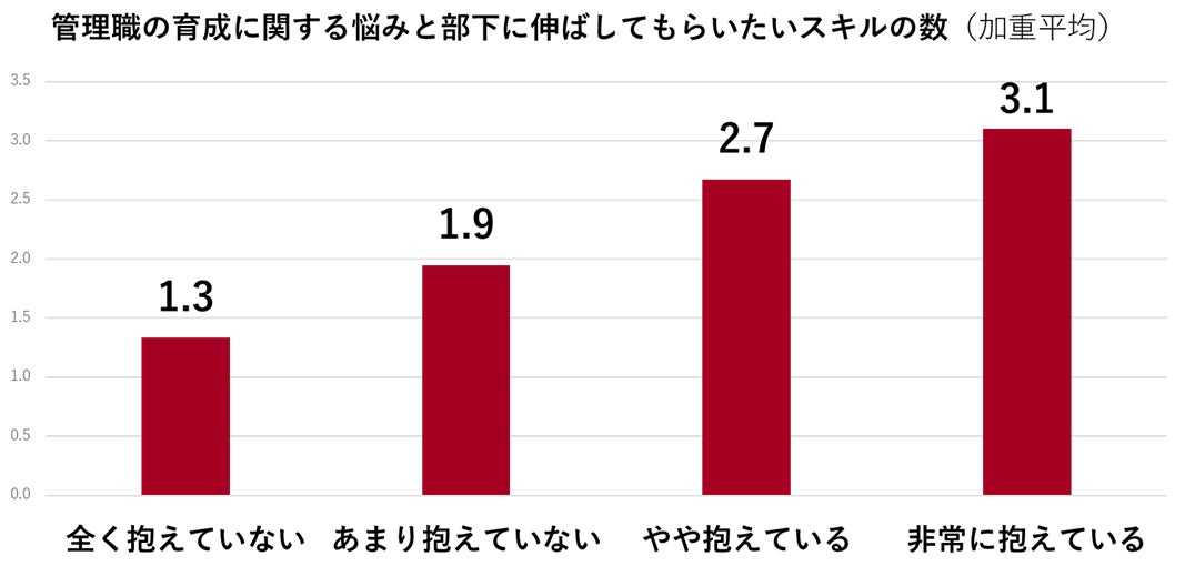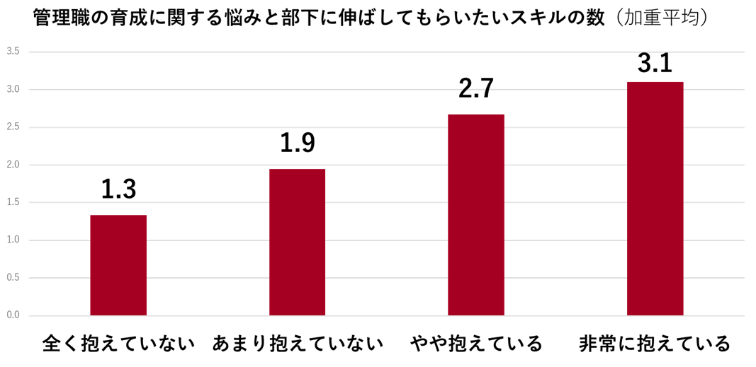 また、部下育成に「非常に悩みを抱えている」と回答した管理職では平均して3.1個のスキルを伸ばしてもらいたいと回答したのに対して、部下育成に「悩みを全く抱えていない」と回答した管理職では平均して1.3個のスキルを伸ばしてもらいたいと回答しました。このことから、部下育成に悩みを抱えているほど、部下に伸ばしてもらいたいスキルが多いことがわかります。