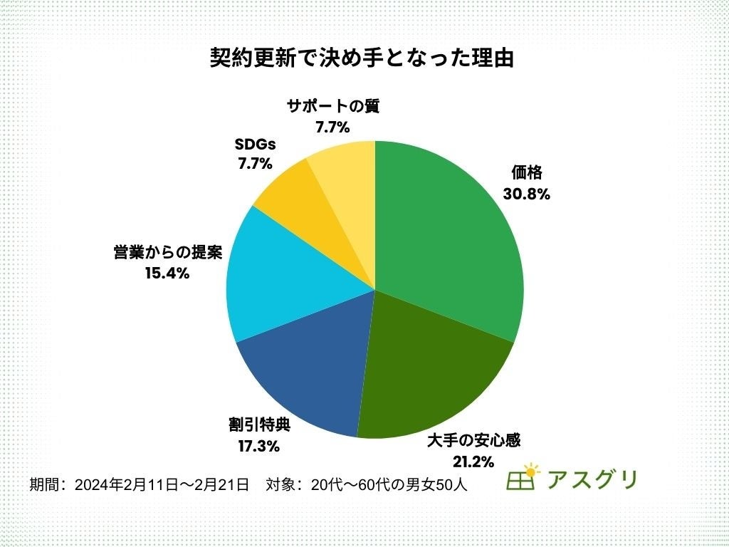 契約変更の第一理由は「価格」で30.8%、次いで「大手の安心感」が21.2%