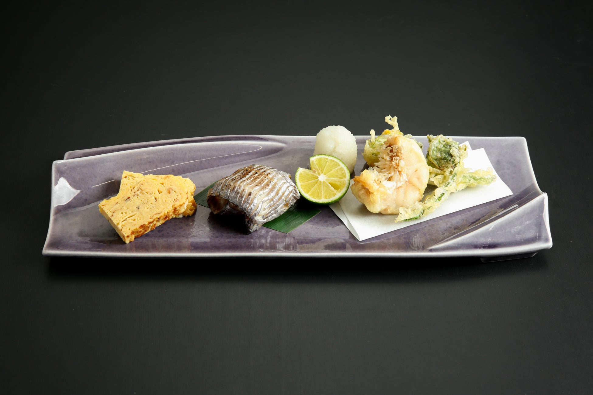 旬の食材を使用した天ぷらと焼き魚、あしらいが添えられた一皿。