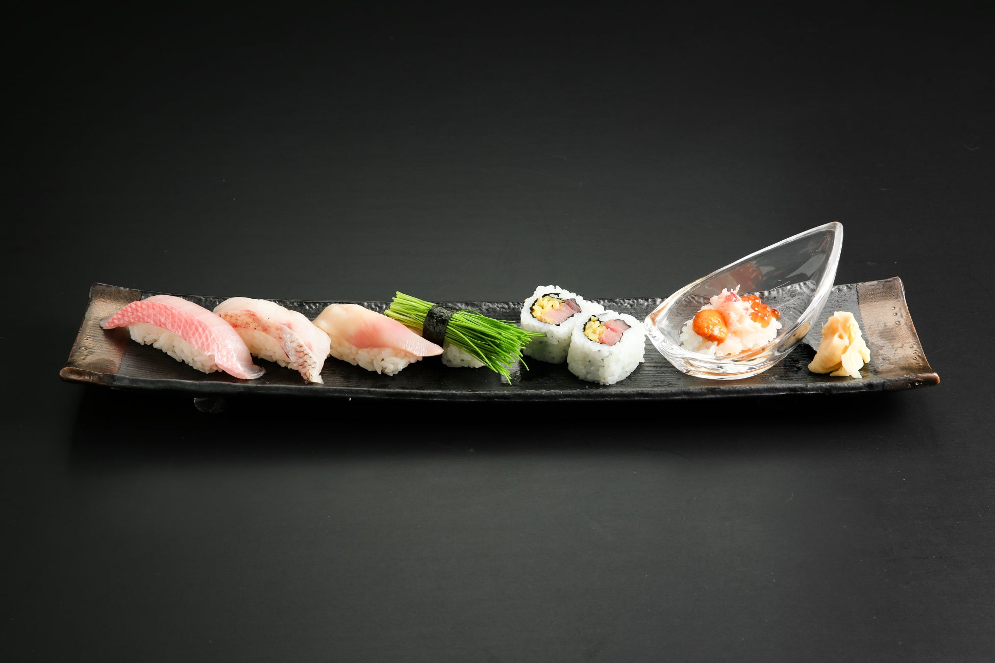 握り寿司4貫、裏巻きトロたくに加え、蟹・いくら・生うにが豪華に盛り付けられた贅沢な一口サイズのお猪口にお味噌汁。