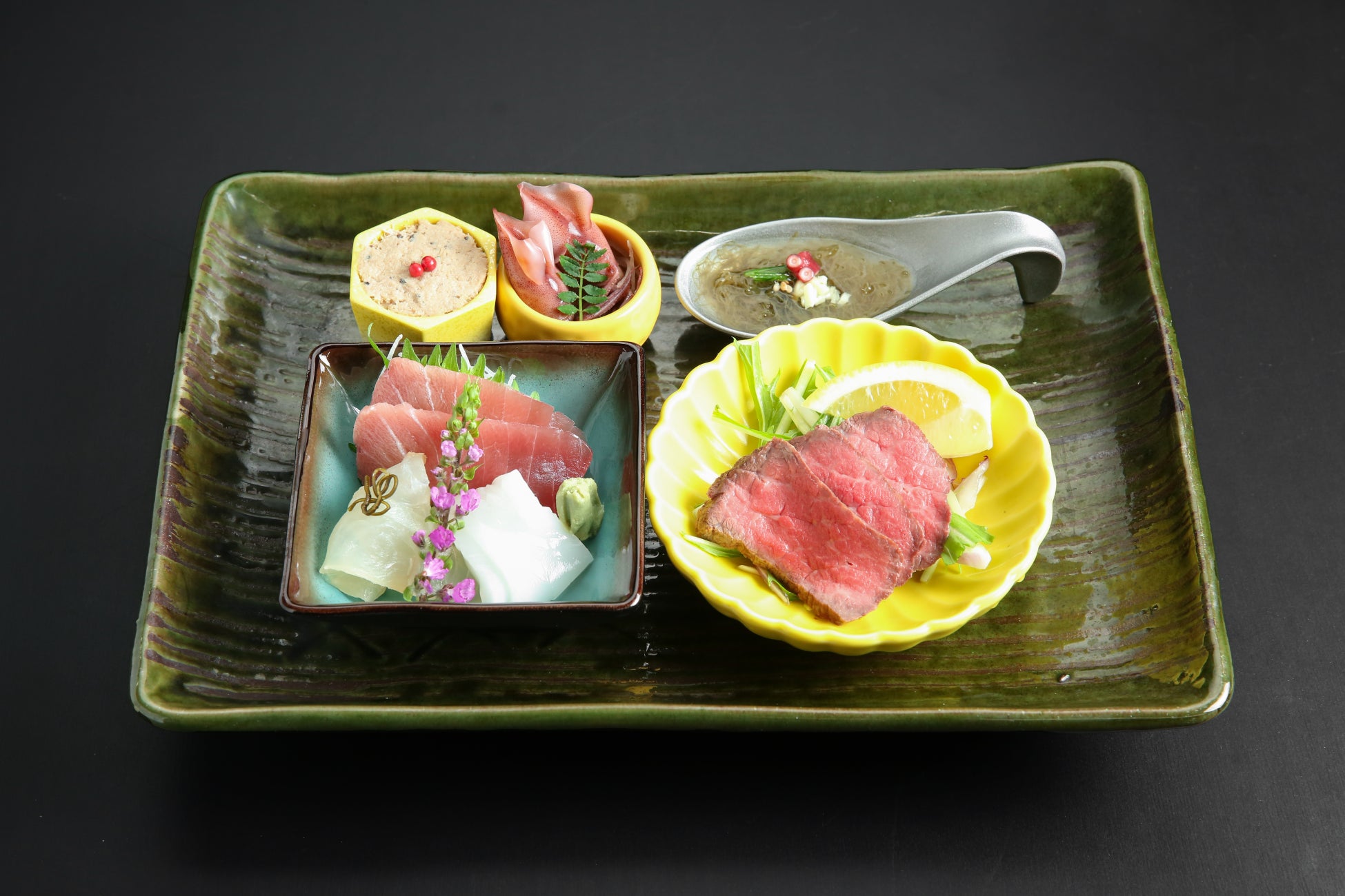 お猪口3点の前菜とお刺身3種盛り、あしたか牛のグリルが美しく盛り付けられた折籠。