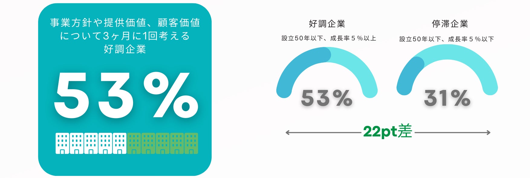 意思決定の見直しに関わらず、そもそも会社や個人として、事業方針や提供価値、また顧客価値について、立ち止まって考える機会の頻度が多い企業の方が好調企業群に属する傾向がありました。