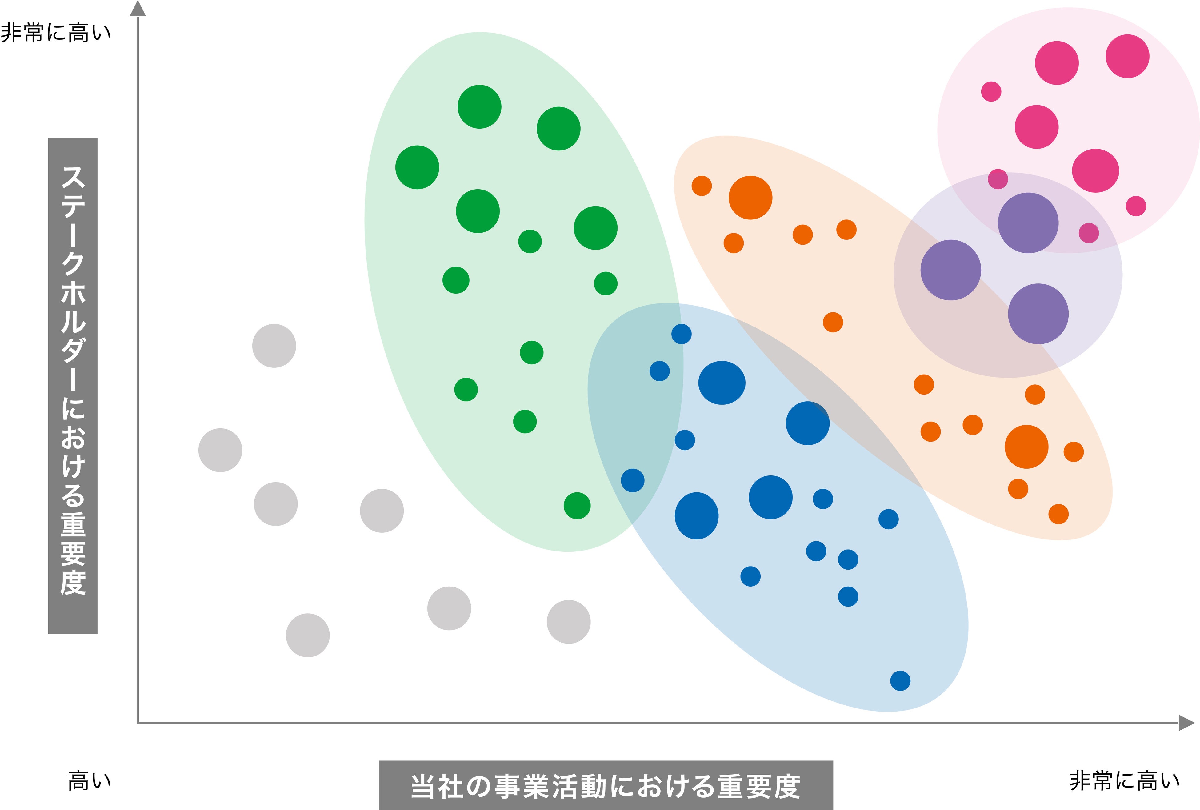 コニカミノルタグループである当社は、コニカミノルタの5つのマテリアリティ「働きがい向上および企業活性化」「健康で高い生活の質の実現」「社会における安全・安心確保」「気候変動への対応」「有限な資源の有効利用」を基盤とし、さらに当社の独自性を加味してマテリアリティを特定しています。SDGs、SASB、GRIスタンダードなどを参考にしながら、2050年を起点とした外部環境分析及びステークホルダーの変化と機会/リスク評価を行い、ステークホルダーにとっての重要度と当社の事業活動にとっての重要度を縦軸と横軸にマテリアリティ・マトリックスを作成しました。 それらを最終的に5つのグループにカテゴライズし、キンコーズのマテリアリティとして設定いたしました。