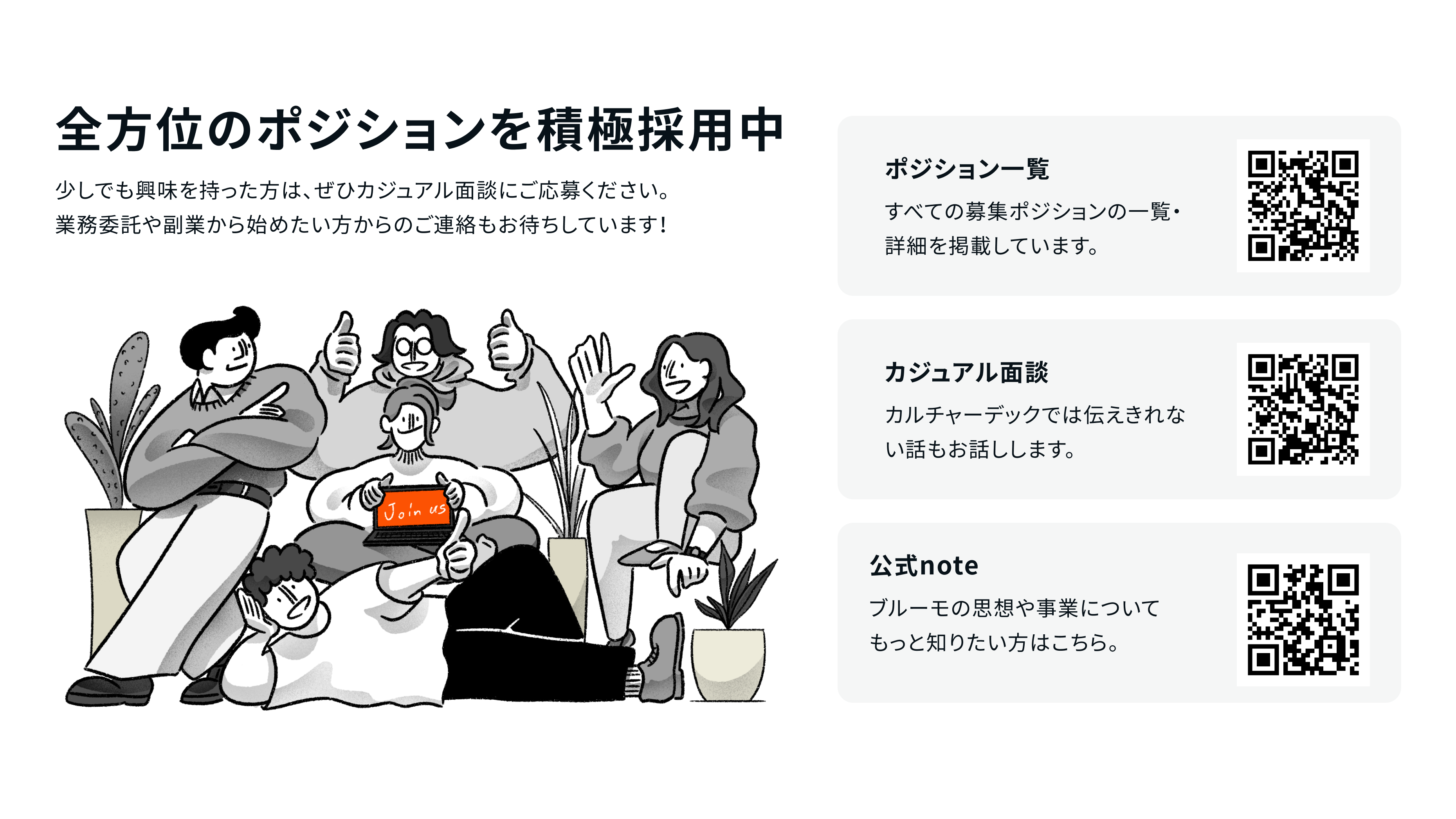 ブルーモは、サービスリリースへ向けての開発スピード加速させています。採用サイト内のカルチャーデックでは、ブルーモで働く意義、待遇や環境などについてご紹介しています。少しでもご興味ありましたら、ぜひご覧の上ご応募ください。
