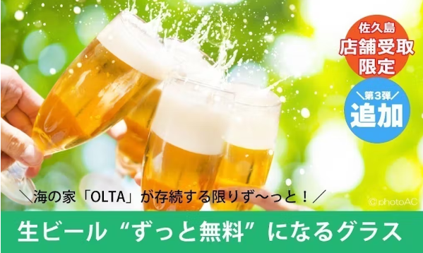 海の家「OLTA(オルタ)」で、生ビールがずっと無料で注文できる「OLTA」ロゴ入りオリジナルグラスです。『お友達や従業員、いつもお世話になっている人たちに注文できる!』5つセットも追加されます。