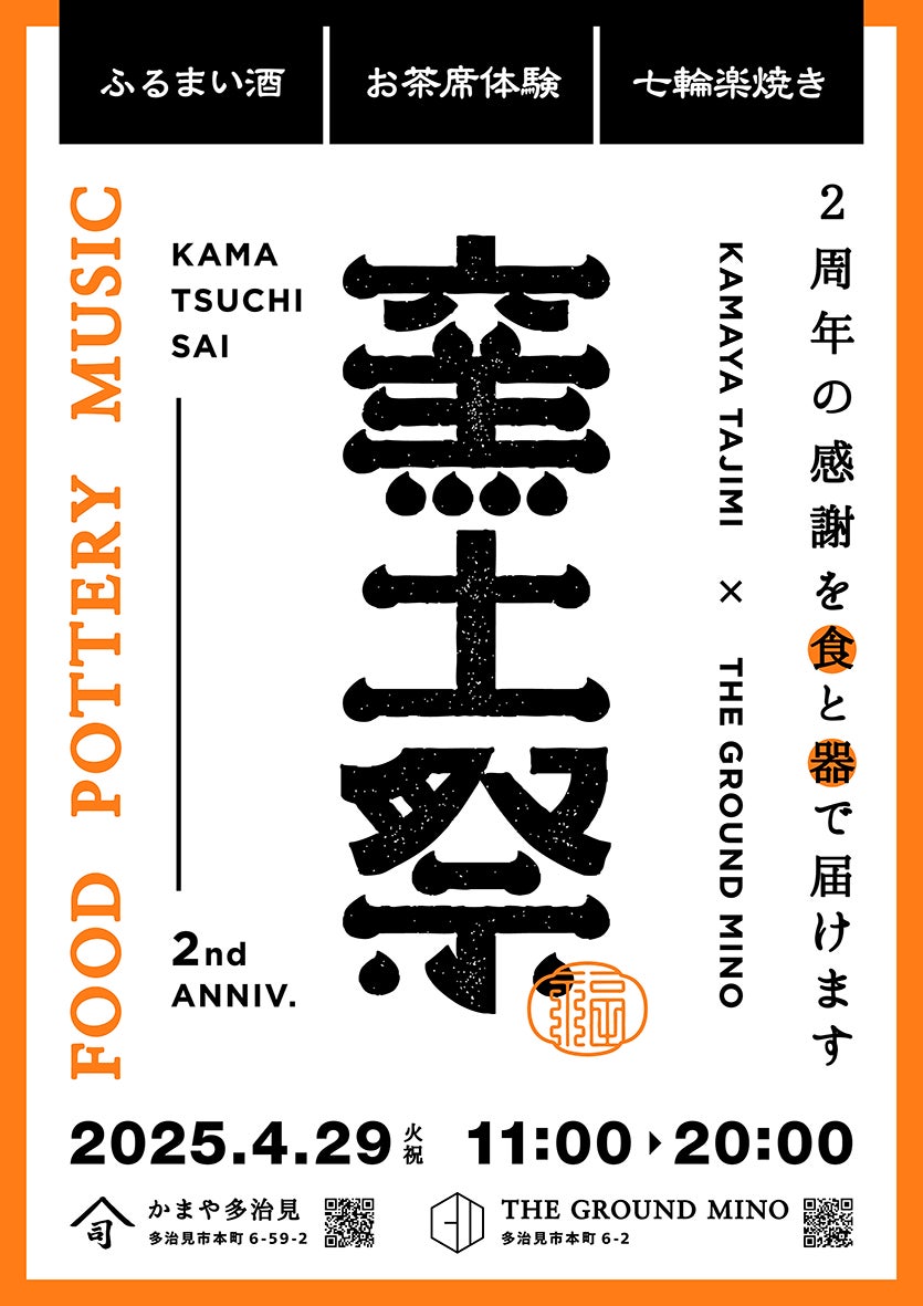 2023年の同日に開業をした二つの施設「THE GROUND MINO」と「かまや多治見」がこの春に二周年を迎えます。周年を迎えられた感謝をいつも支えていただいているお客様、近隣の皆さまへお伝えしたく「窯土祭」と名付けた感謝祭を開催いたします。