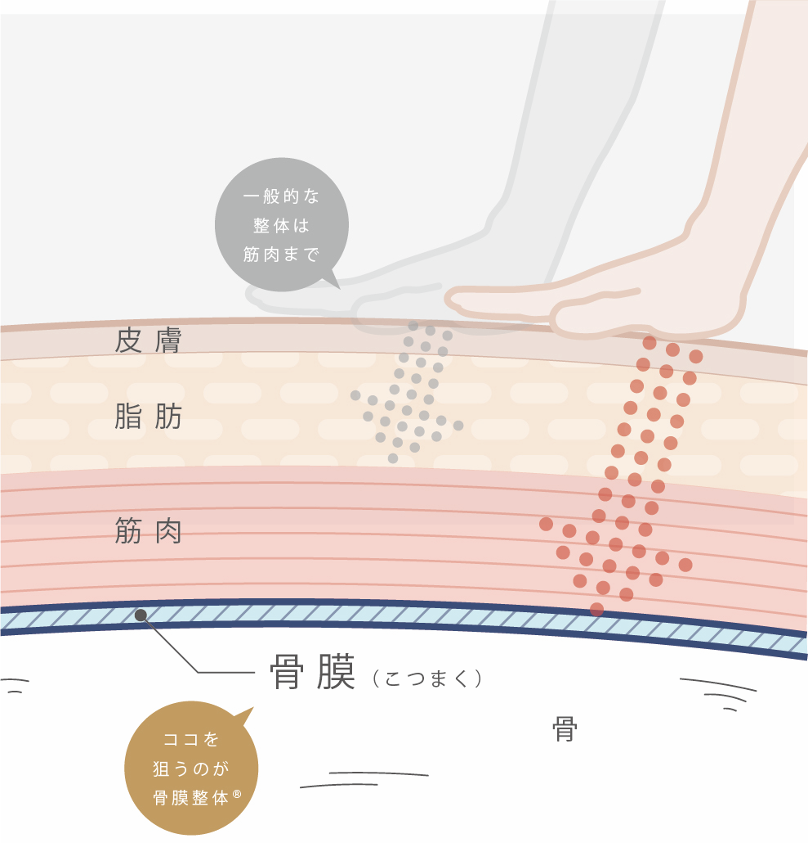 一般的な整体の施術は、脂肪と筋肉の間で筋肉の表膜となる“筋膜”にアプローチすることが基礎となっていますが、『骨膜整体®︎』はさらにその深層にある、筋肉を通り越して骨に到達する直前にある“骨膜”にアプローチします。