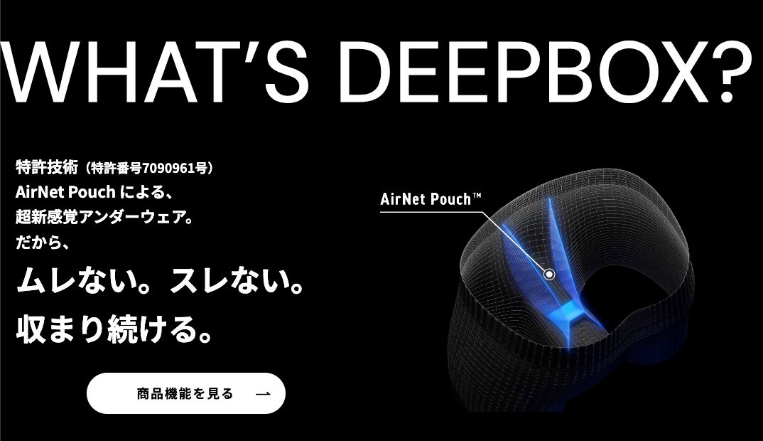 ”常識を、履き替えよう” をコンセプトに開発された独自の特許技術AirNet Pouchによって、これまでにない着用体験をお届けいたします。特許技術により「ムレずに、収まり続ける」超新感覚アンダーウェアです。公式サイトでは、Deepboxアンダーウェアの " 10の商品特徴 " についても記載されています。下記のボタンからアクセスしてご覧ください!