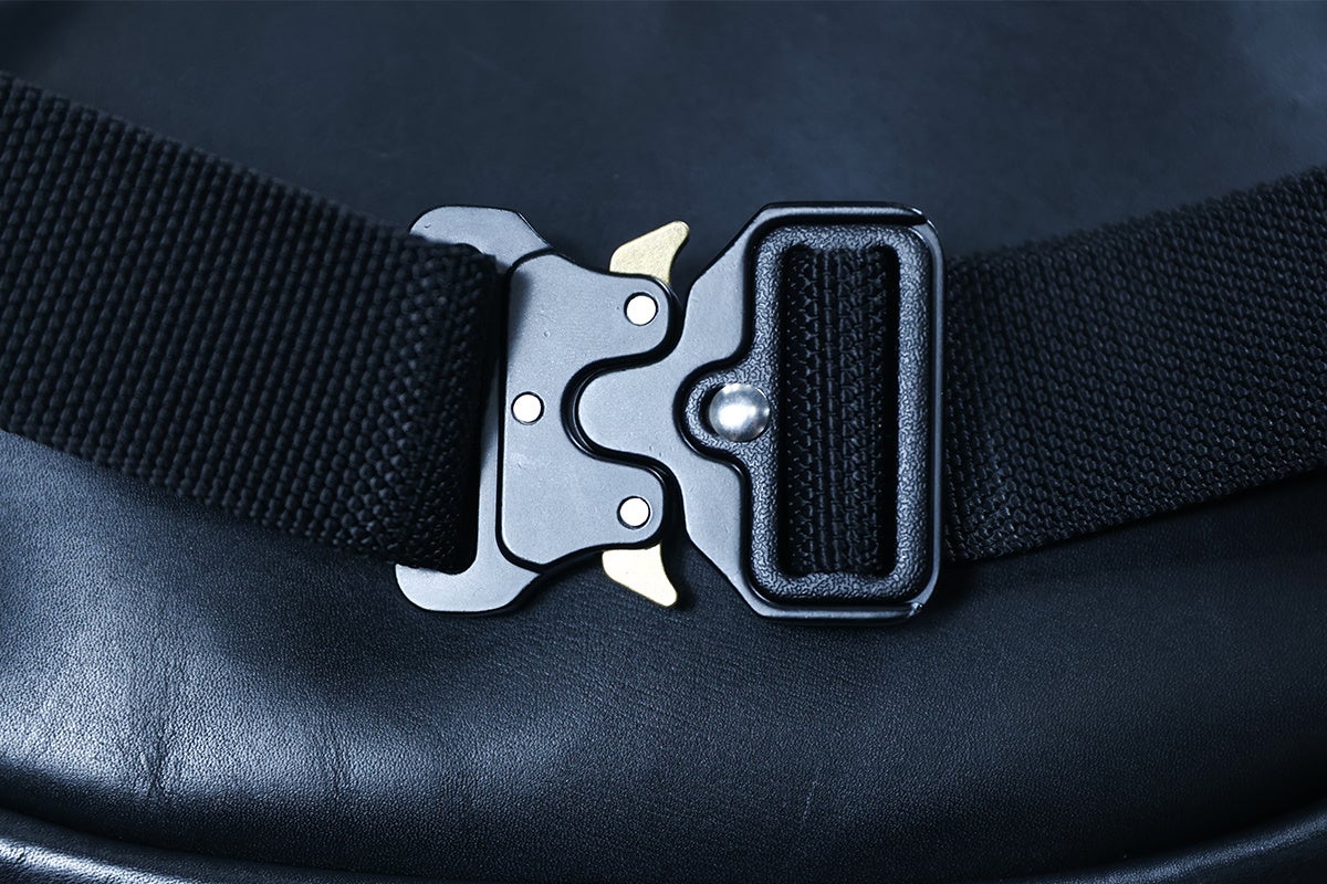 軍用でよく使われるバックルをこちらのバックに活用しています。堅牢性だけでなくメタルな雰囲気に一助しているのも特徴です。