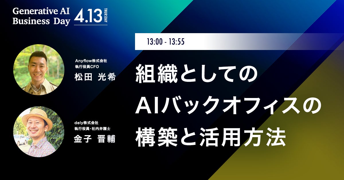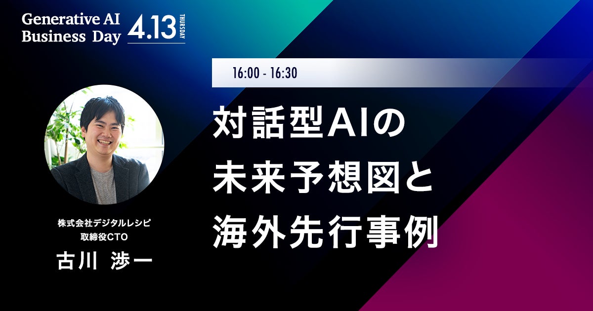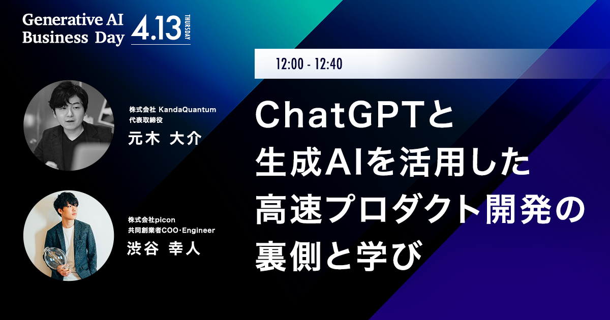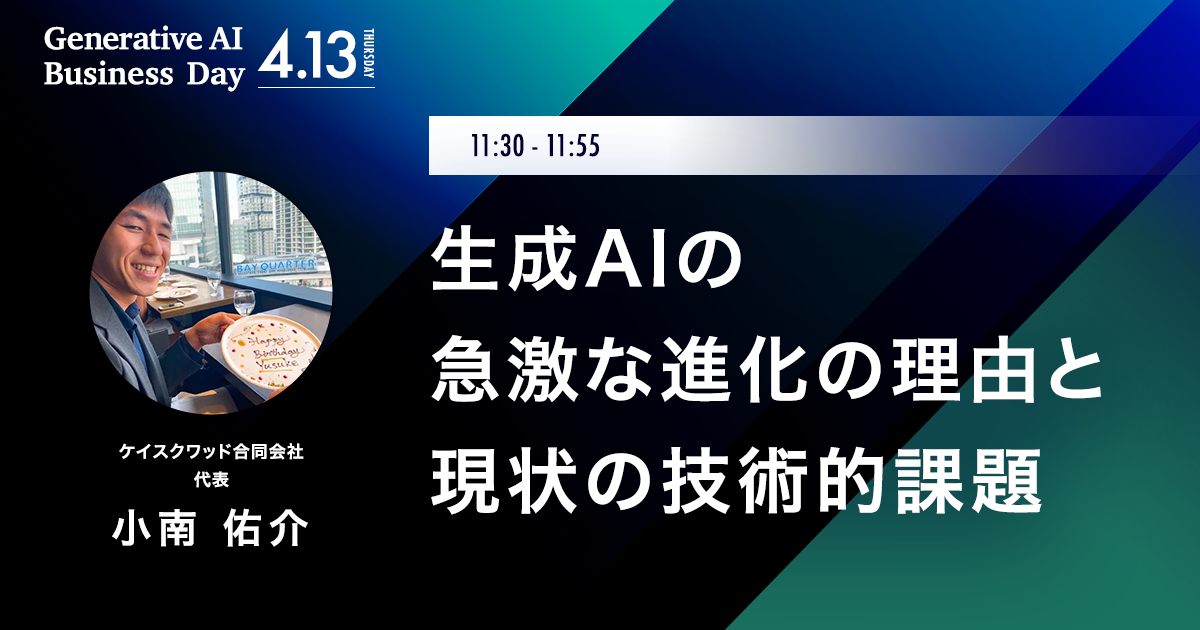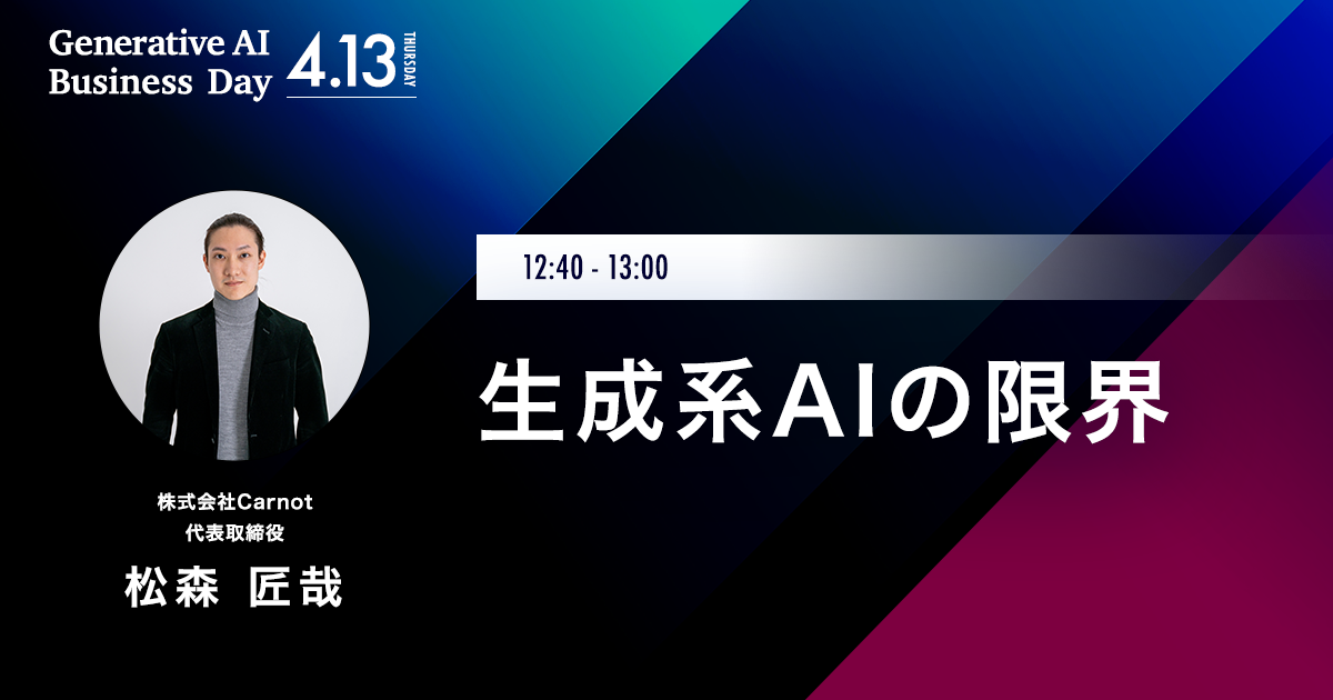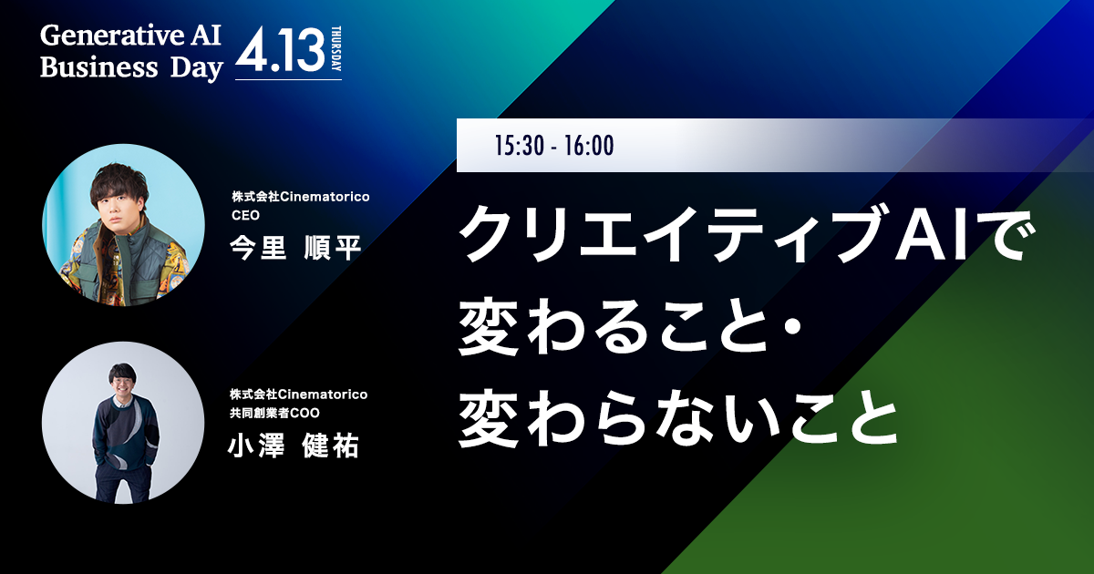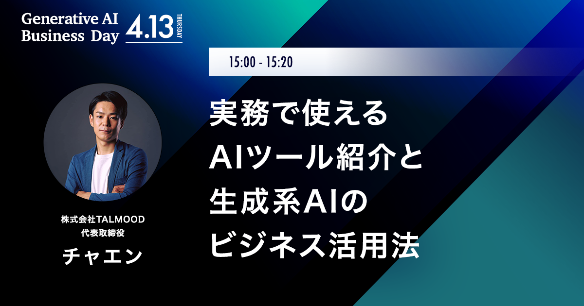 Cynthialy株式会社(東京都渋谷区、代表取締役 國本知里)が2023年4月13日(木)に開催する、ChatGPTをはじめとしたGenerative AI(以下、生成AI)のトレンドからビジネス活用事例までを学べる丸1日のオンラインイベント「Generative AI Business Day」において、イベント発表から大きな反響をいただいており、新たに林 駿甫氏の登壇が決定いたしました。セッションの追加に伴い、イベントの終了時刻を17:30に延長いたします。