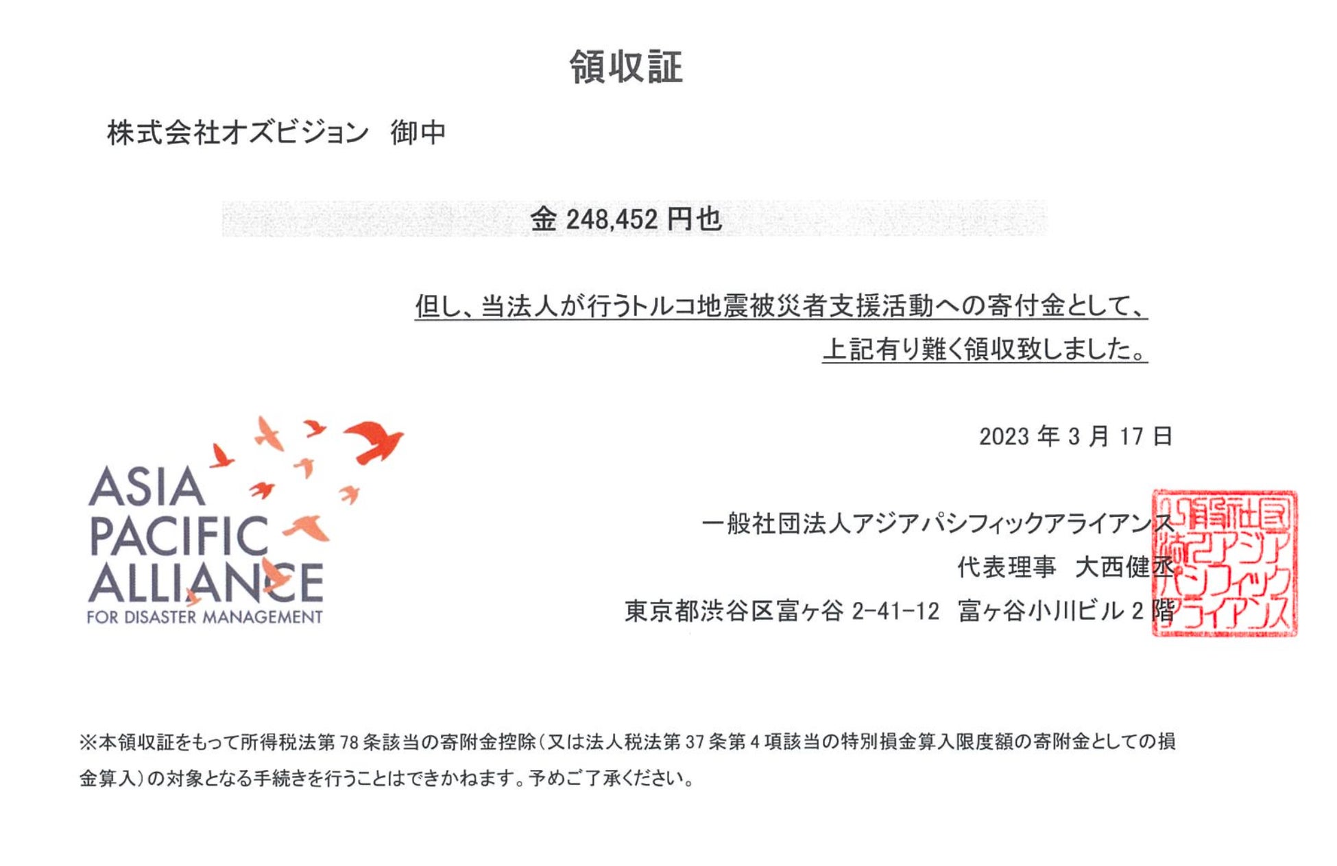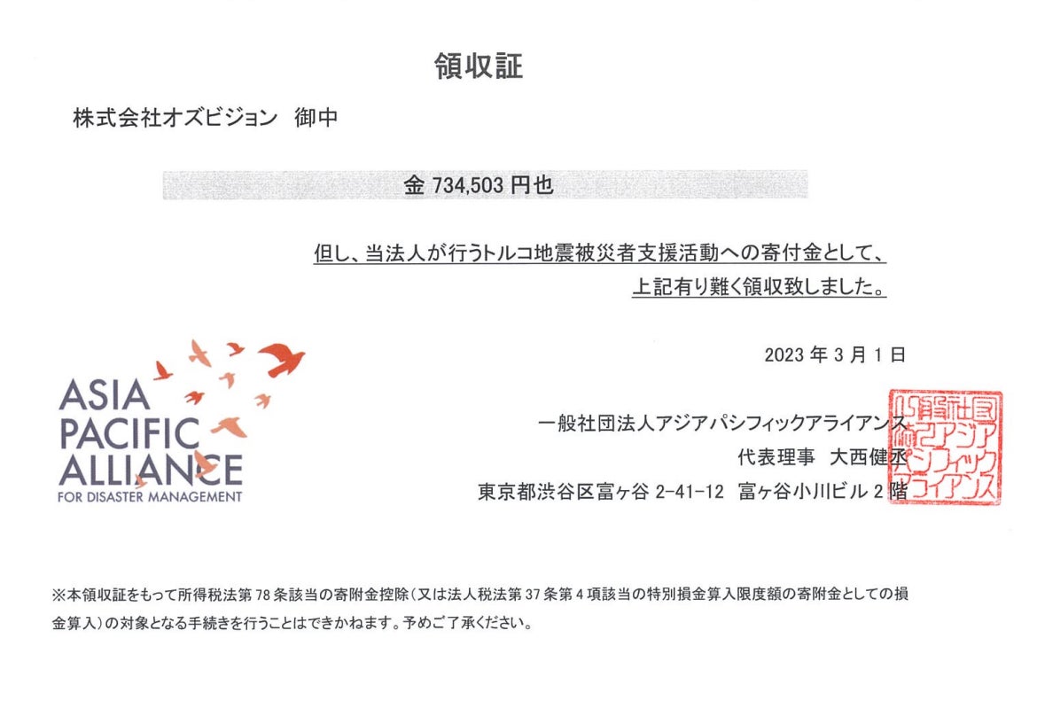 2023年2月15日(水)から開始いたしました、トルコ・シリア地震支援募金ですが、一般社団法人アジアパシフィックアライアンス(A-PAD)への送金を実施致しましたのでご報告申し上げます。