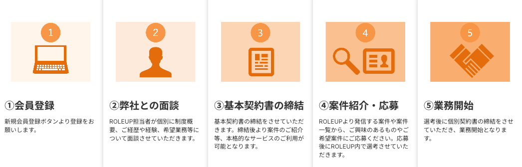 PEファンド出身者やディールアドバイザー経験を有するROLEUPメンバーがプロジェクトマネジメント・フォローを行うため、登録者様の経験が浅い業務領域でも、積極的に取り組むことが可能です。