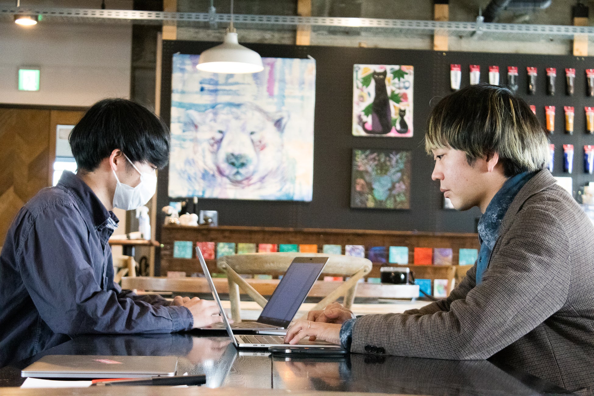 のびのびと創作活動ができ、互いの表現を共有しあえる「表現者たちの秘密基地」を目指してつくられたコワーキングスペース。画材やWi-Fi、電源など創作や作業に必要な設備が揃っています。