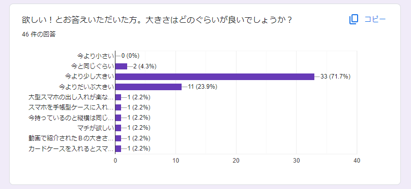 55名の方がお答え下さり、一番多かったリクエストが「もっと大きいサイズがいい」でした。
