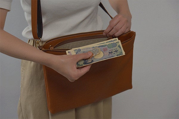 前作より大きく、マチをつけ、ファスナー開閉で、ズボラポケットを取り外せる「ズボラサコッシュ-Large-」。