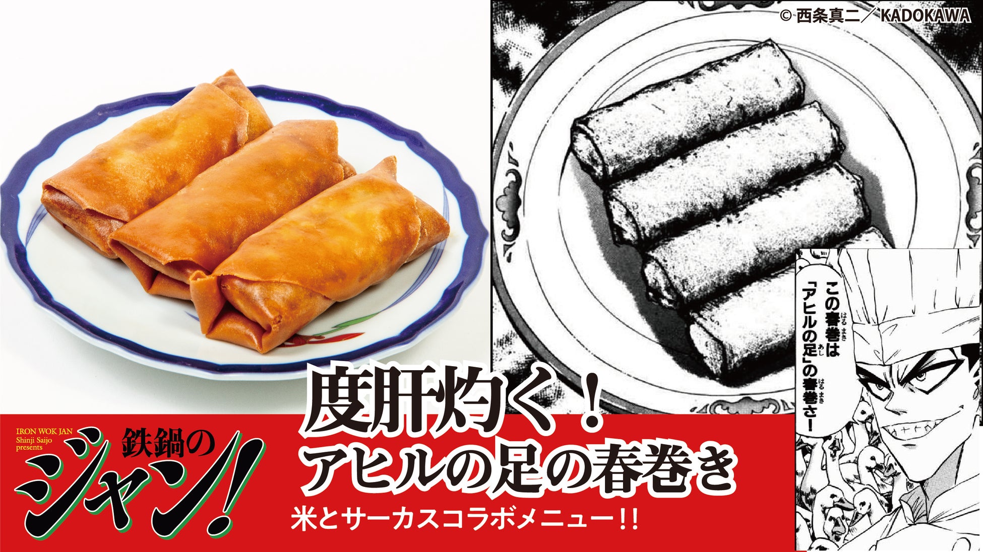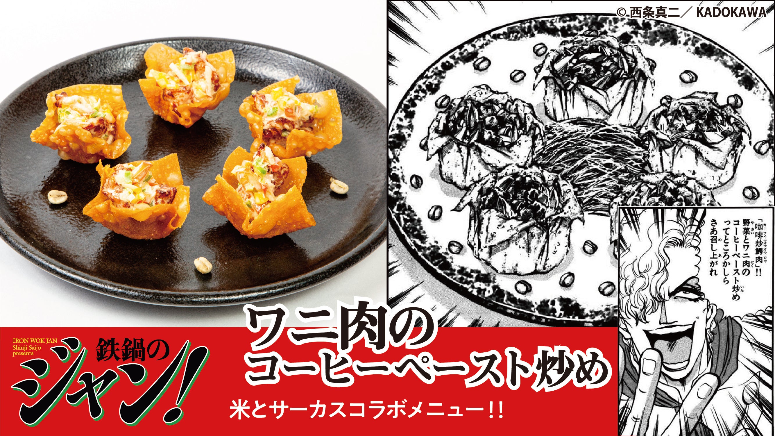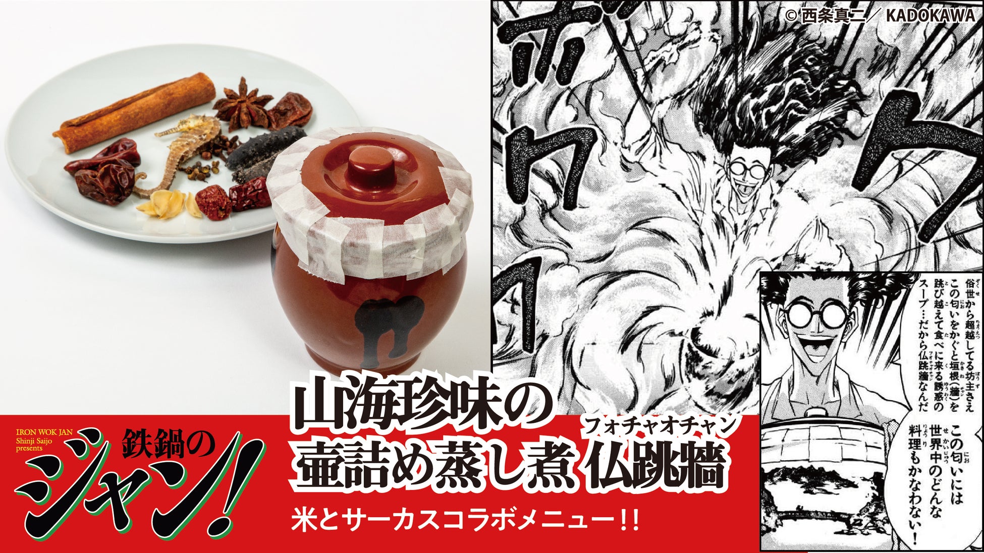 作中登場する「アヒルの足の春巻き」「ダチョウ肉のカルパッチョ仕立て」「ワニ肉のコーヒーペースト炒め」「羊の脳みその茶碗蒸し」「山海珍味の壷詰め蒸し煮 仏跳牆」「ハクビシンの地獄鍋」「サメの丸ごと一匹揚げ」の7品を米とサーカスで再現しました。
