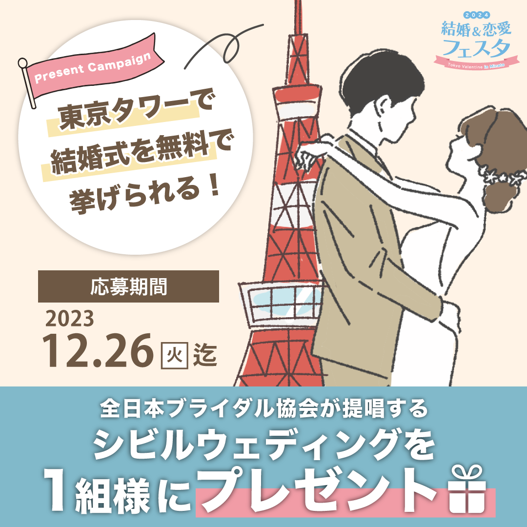 2024年2月12日(祝・月) 東京タワーメインデッキにて挙式・ウェディングドレスショー開催!!全日本ブライダル協会が提唱する「シビルウェディング」にて挙式を執り行うカップルを大募集!!