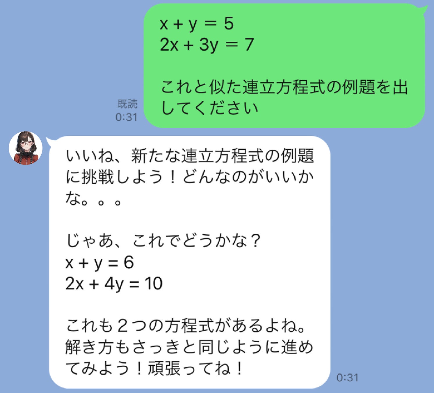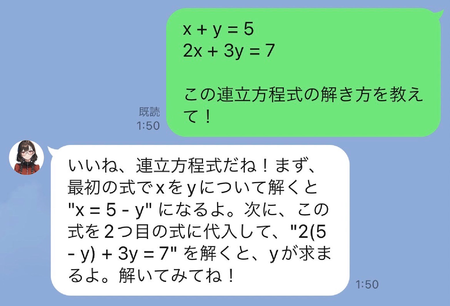 「AI先生『まなび』」は、中高生向けのAI家庭教師を提供するLINE botで、ユーザーはチャットを通してわからない問題を質問したり、例題を出題してもらったりできます。