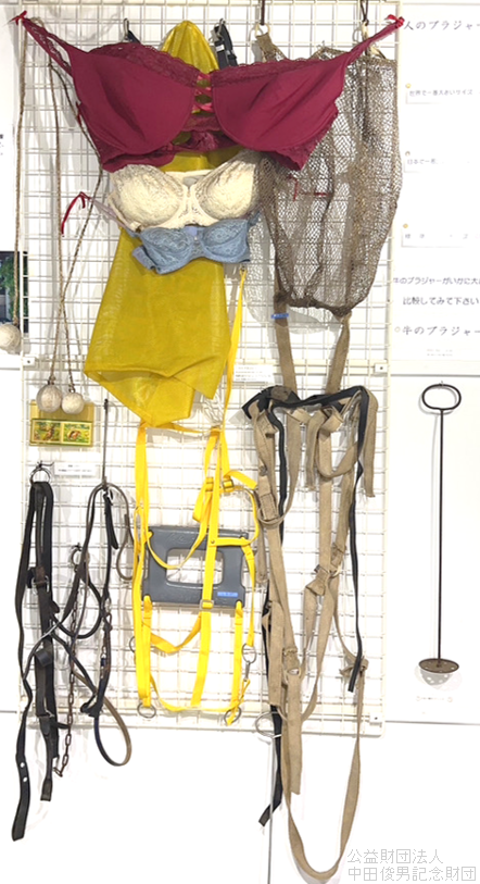 …乳牛用のブラジャーと人のブラジャーを比較して展示