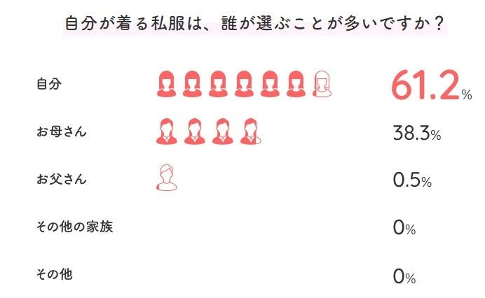 全国の小学校3年生~6年生の女子200名(各学年50名)に対し、保護者を介して、『自分が着る私服は、誰が選ぶことが多いですか?』と聞いたところ、61.2%が「自分(お子さまご自身)」と回答。次いで38.3%が「お母さん」と答え、半数以上の子どもが自分の着る服を自ら選んでいることがわかりました。