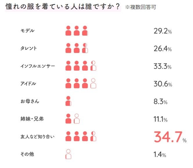 ④「憧れの服を着ている人」は1位が「友人など(34.7%)」。2位以下に「インフルエンサー(33.3%)」「アイドル(30.6 %)」「モデル(29.2%)」など著名人という結果に。