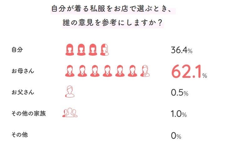 『自分が着る私服をお店で選ぶとき、誰の意見を参考にしますか?』という質問に対し、1位は6割以上(62.1%)のスコアで「お母さん」となり、「お父さん」と「その他の家族」は合わせて1.5%という結果に。お母さんの意見を参考にする子が6割を超える一方で、自分で選ぶという子が4割近くいることがわかりました。
