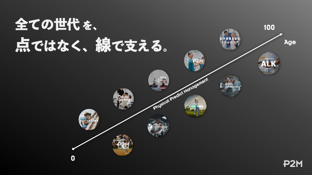 40歳以上のためのフィットネス・ラボ P2M、30歳以上の方のコンディショニングジム P2M joiru、若い世代の女性に向けたパーソナルジム P2M Runway、小中学生のためのパフォーマンスセンター P2M JUNIOR を地域の半径1km以内に展開。