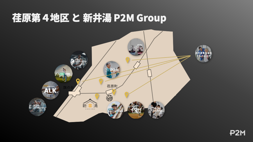 その想いの象徴として、全店舗の中心的存在となる拠点、コンディショニングセンター「P2M Performance」を2023年4月、半径 1km圏内を範囲とする地域内の4店舗として品川区旗の台にオープンいたしました。