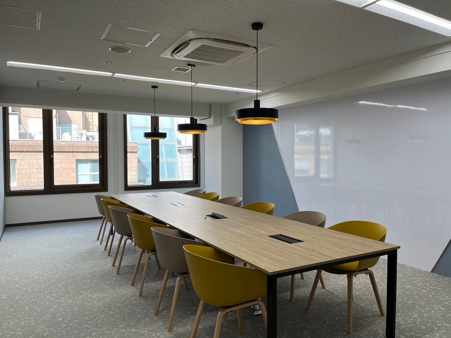 来客者の方にも使っていただくことがある会議室は、木目調のテーブルや椅子を使用しております。社員だけでなく来客者の方にも居心地のいい空間を提供できるよう、落ち着きのあるあたたかい雰囲気作りを心がけております。