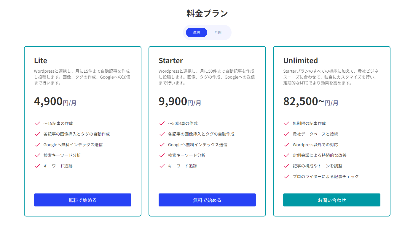 Starterプラン:月50記事 月額9,900円(年契約)/16,500円(月契約)