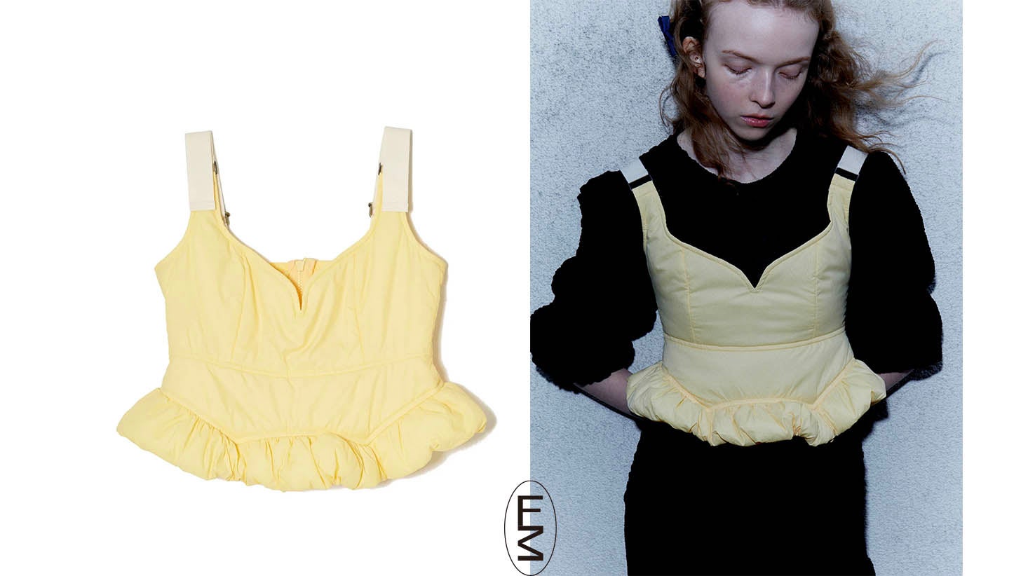 Foundry Mewsのエッセンスを取り入れたコルセット風ベスト。このベストはフリルとぴったりしたフィット感を組み合わせ、一体感のあるデザインになっています。バックデザインがゴムが付いている為、フリーサイズで幅広い方に楽しんで頂けるデザインです。