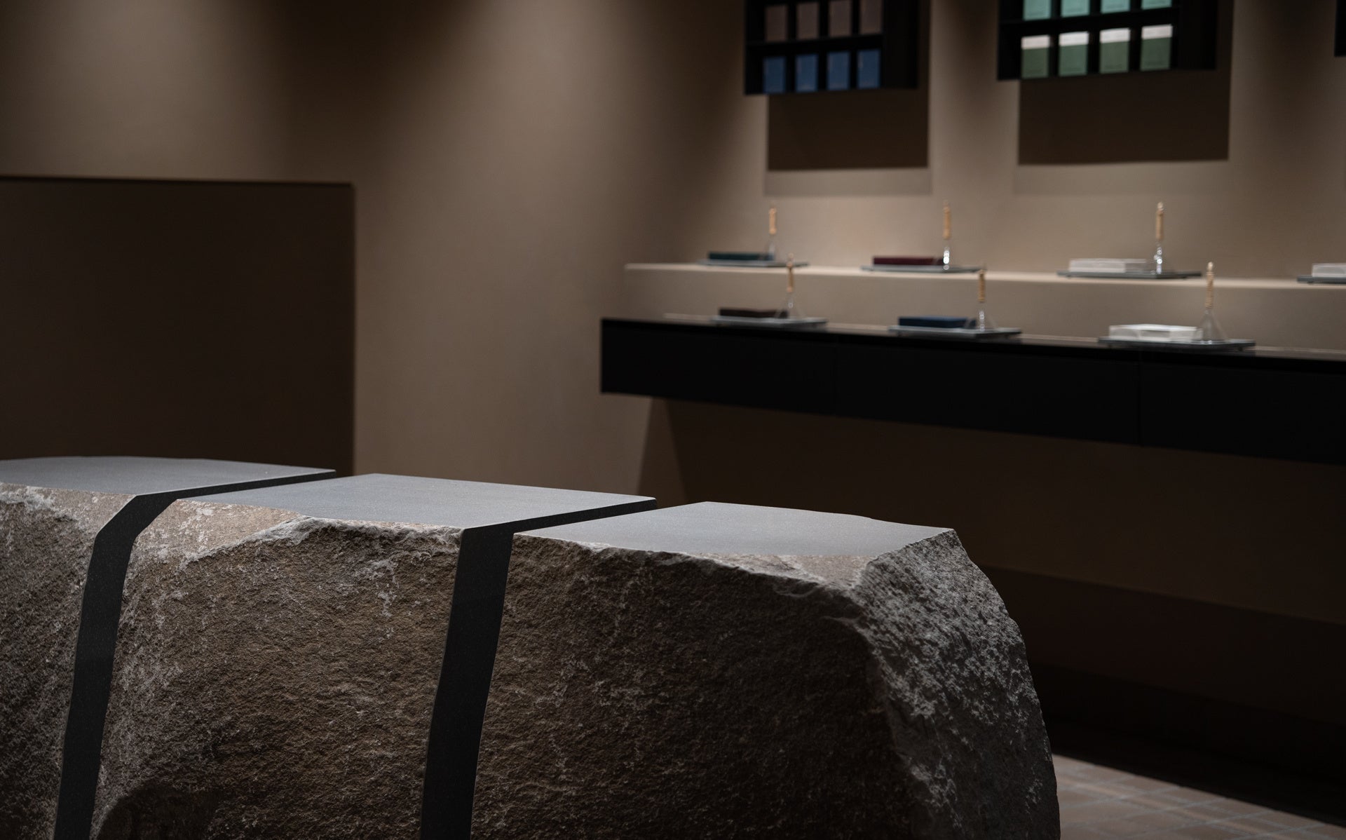 店舗の中央にしつらえた石の什器は、小松石という石を使用しています。小松石は加工法や見る角度によってさまざまな表情に変化することから、その時の気分や場所、時間の移ろいによって表情を変えるインセンスの香りとも通じるものがあります。